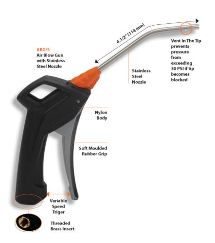 Professional Air Blow Guns. Redefining the Industry Standard, the Groz Air Blow Guns are both technically & aesthetically superior to any other gun. High Impact & Weather Resistant. Gun body is made from Nylon with a Brass Threaded Insert ¼” BSP (F). Gun Nozzle, Tubes & Springs are made from Stainless Steel. Gun uses Nitrile Rubber Seals. The gun has a soft moulded grip for highest convenience in use & a large handle for ease of operation. Designed with a Variable speed trigger, the gun allows for complete control on the air dispensed. Operating Pressure: 3.5 BAR to 16 BAR