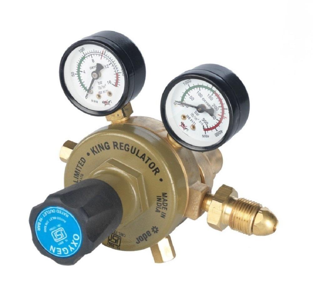 Ador King Dual Stage Pressure Regulator Precision Control, Unmatched Durability The Ador King Dual Stage Pressure Regulator is engineered for exceptional performance and safety. Designed for demanding industrial applications, this regulator ensures precise gas control with unmatched reliability.   Key Features: Robust Construction: Built with a forged brass first stage and die-cast alloy second stage for superior strength and durability.   Leak-Proof Performance: Teflon moulded valve and stainless steel spindle guarantee leak-free operation.   Superior Pressure Control: Stainless steel diaphragm in the first stage absorbs high-pressure shocks, while a flexible rubber diaphragm in the second stage provides fine gas adjustment.   Stable Gas Flow: The enlarged second stage plenum chamber ensures consistent gas delivery.   Safety First: Dual safety valves offer maximum protection against pressure surges.   Experience the difference with Ador King.