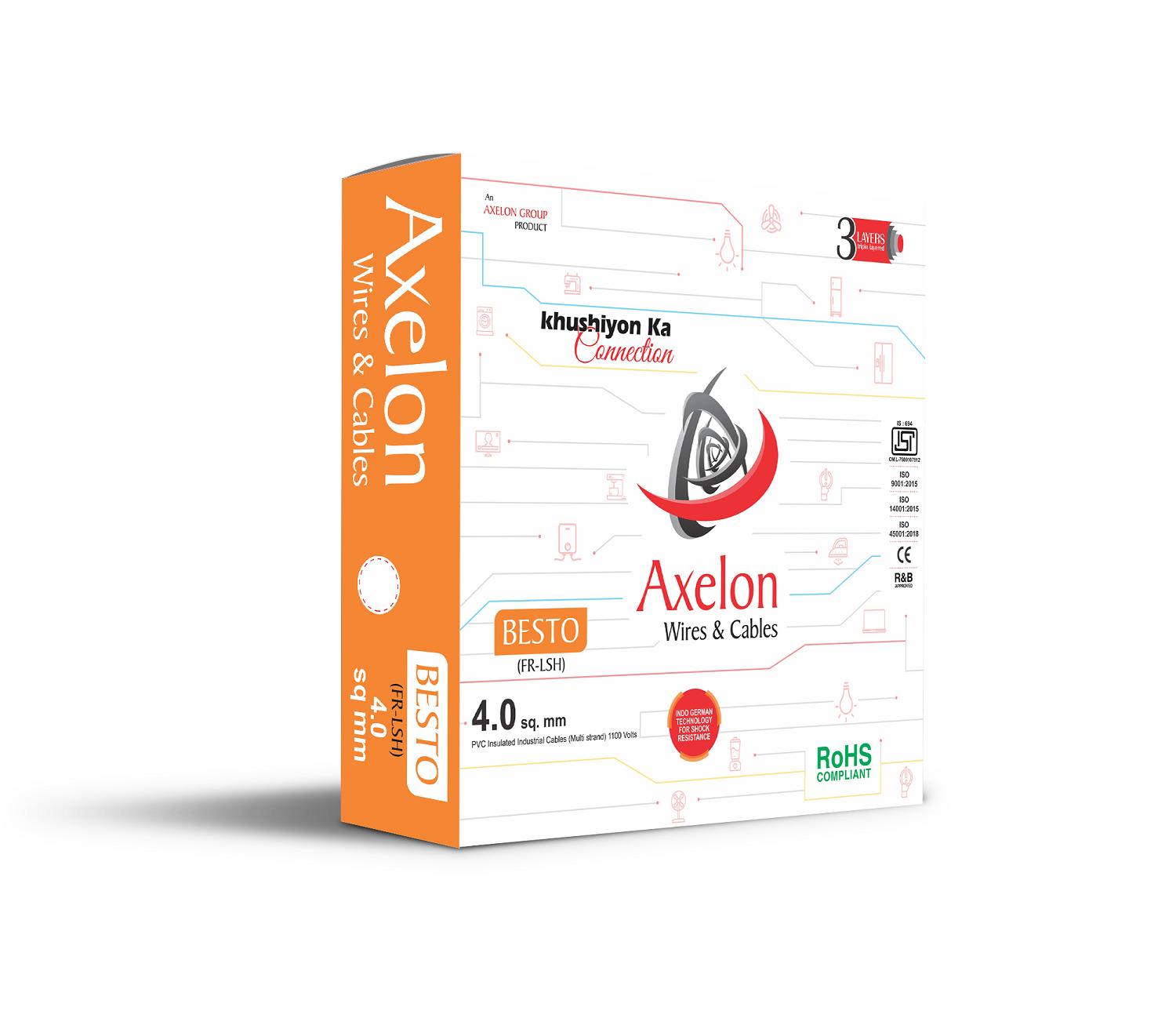 100% Spark Tested | 99.97% Copper purity | 101% Conductivity | RoHS Compliant | More than 30% oxygen index | 100% Bunched copper | Cables printed with AXELON BESTO FR LSH