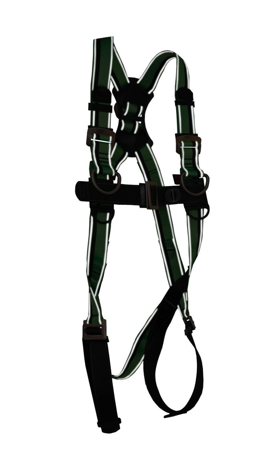 Full Body Harness with 2 sternal D Rings, Fully adjustable chest, shoulder and thigh straps, Reflective tape on both sides, Lanyard parker at chest level