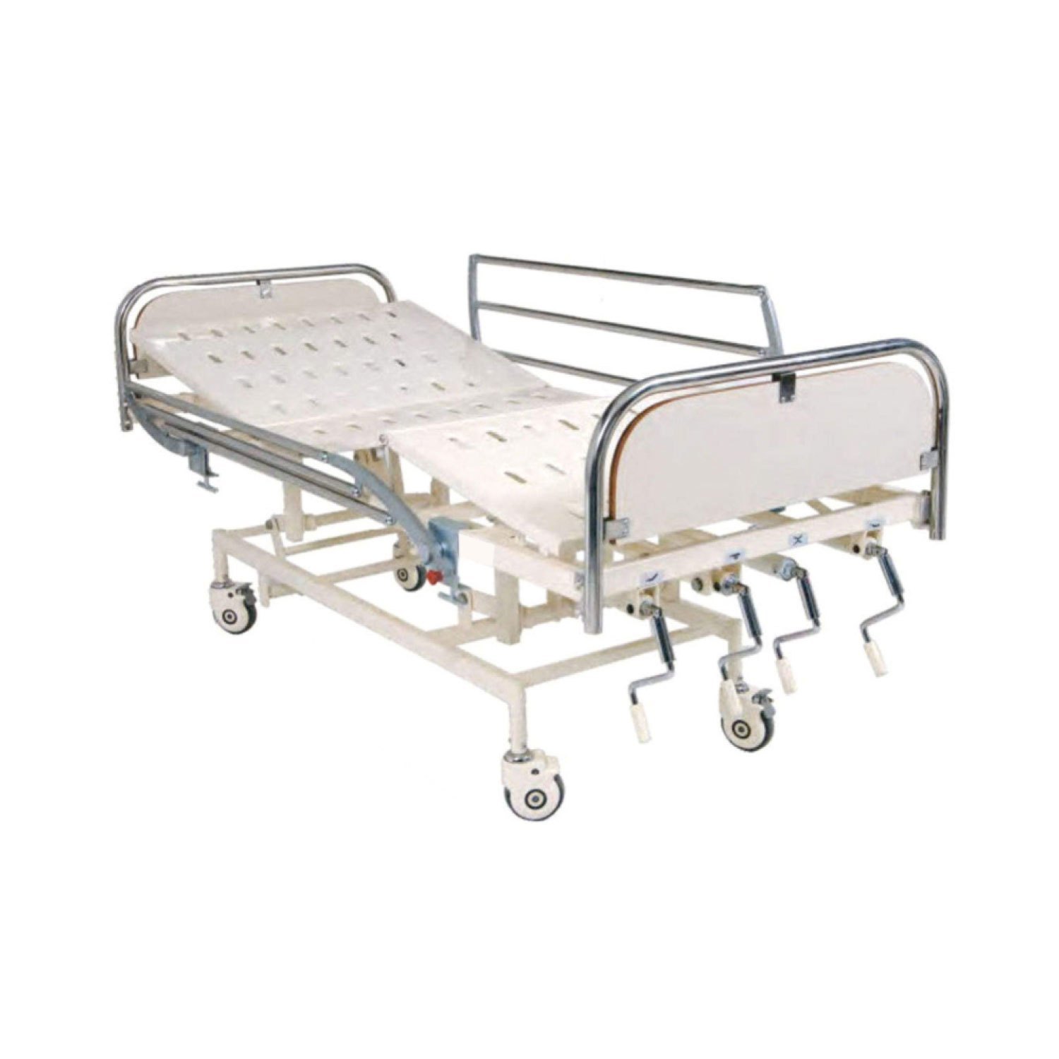The Carevel C 1204 Deluxe Mechanical ICU Bed is a robust and reliable intensive care unit bed built for hospitals and critical care wards. It’s a mechanically adjustable bed, meaning healthcare staff can change the position of different sections of the bed using smooth, manual crank handles rather than electric motors — a practical choice where electric beds aren’t needed or power supply is limited. This bed has a 4-section mattress platform made from strong CRCA sheet for durability and easy cleaning. It includes detachable head and foot panels with a neat finish, and safety side rails that can be folded down to help prevent patients from falling out. The backrest and knee rest sections can be adjusted manually with dedicated handles, allowing caregivers to position patients comfortably for resting, treatment, or eating. The bed is mounted on heavy-duty wheels with diagonal locking so it can be moved when needed and secured in place. All metal parts are epoxy powder