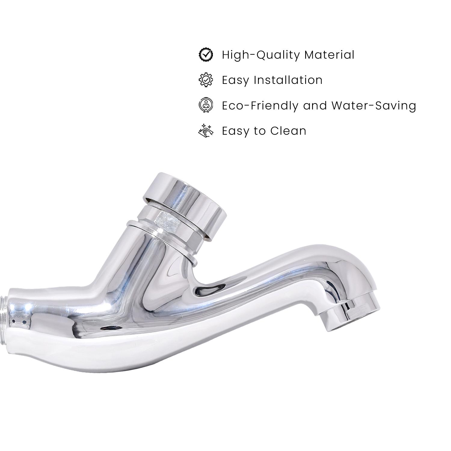 "Material: Brass Finish: Chrome Features: Durable, Long-Lasting, Leakage-Proof, Zero Maintenance Description: Elevate your bathroom with this sleek and efficient Pressmatic Auto-Closing Bib Cock, designed for Multi Areas taps. Crafted from high-quality brass with a chrome finish, it offers both durability and a polished look. The advanced auto-close mechanism ensures zero leakage and minimal upkeep, making it the ideal choice for a hassle-free bathing experience. Easy to install and perfect for adding a touch of elegance to your bathroom. Package Includes: 1 Push Cock with Wall Flange Quality: Thoroughly Inspected for Optimal Performance" AUTO CLOSE FUNCTION