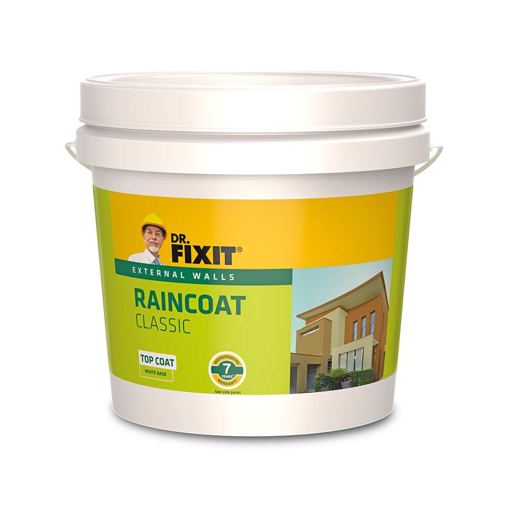 Dr. Fixit Raincoat Classic external wall coating is based on Reactive Acrylate Copolymer technology, especially formulated for superior performance when applied properly on exterior walls due to its unique water-resistant properties and resistance against fungi, algae, and dampness caused by lashing rain. The presence of a flexible emulsion resin binder, special preservatives, and other additives makes it an excellent durable coating with long-lasting colour brightness. When applied as a system along with Raincoat Waterproof Coating as a base coat, plus Raincoat Classic as a topcoat.