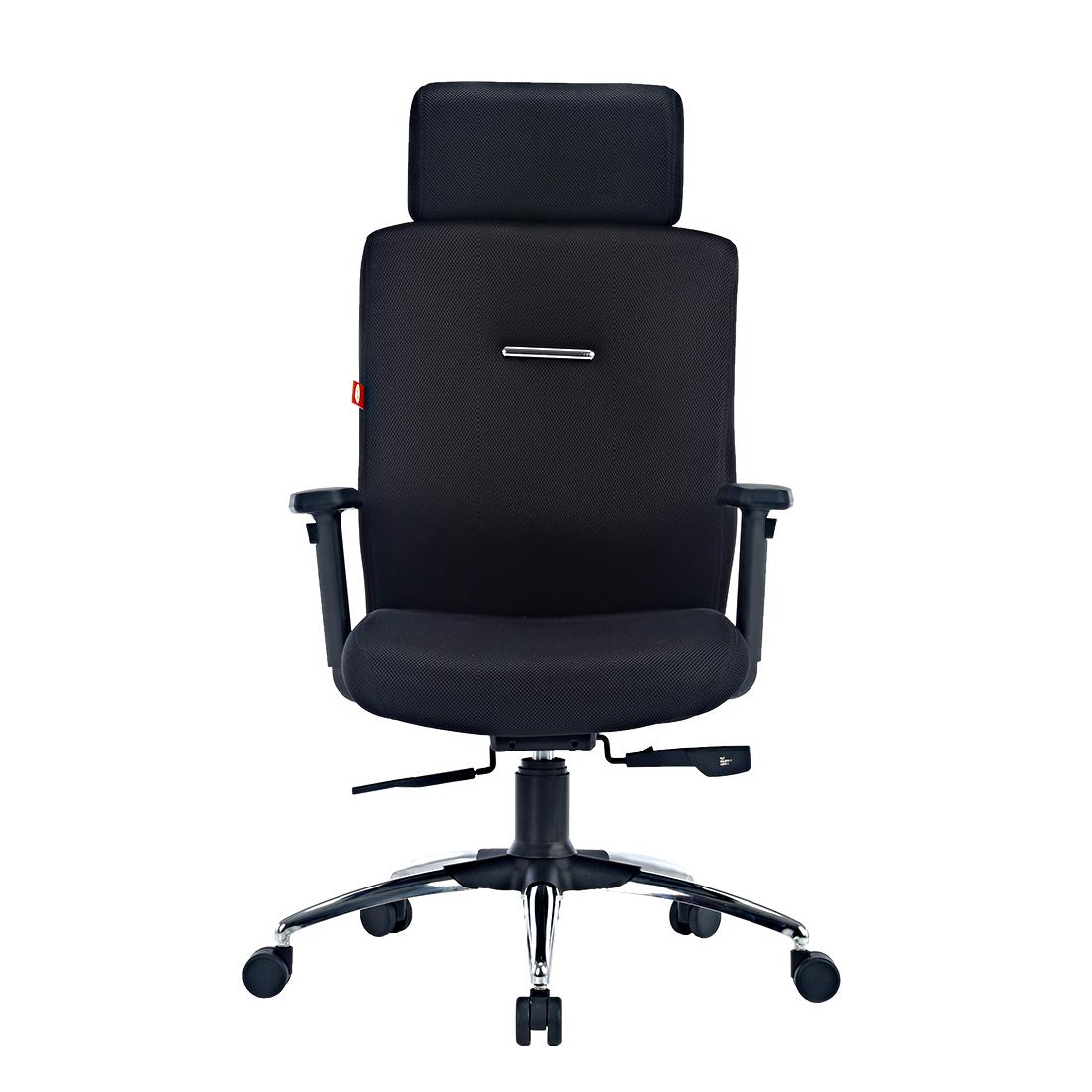 High-quality soft fabric upholstery with high abrasion resistance and superior tear strength & colourfastness. Premium high-density moulded foam for comfortable seating. Curved backrest with excellent lower back support for natural spine alignment. Pneumatic Height Adjustment with Class IV gas lift. Adjustable headrest with Synchro Single Locking and Tilt tension control for improved mobility. Chrome base with 5star Nylon Cover & 55mm castors for increased stability and non-friction movement.