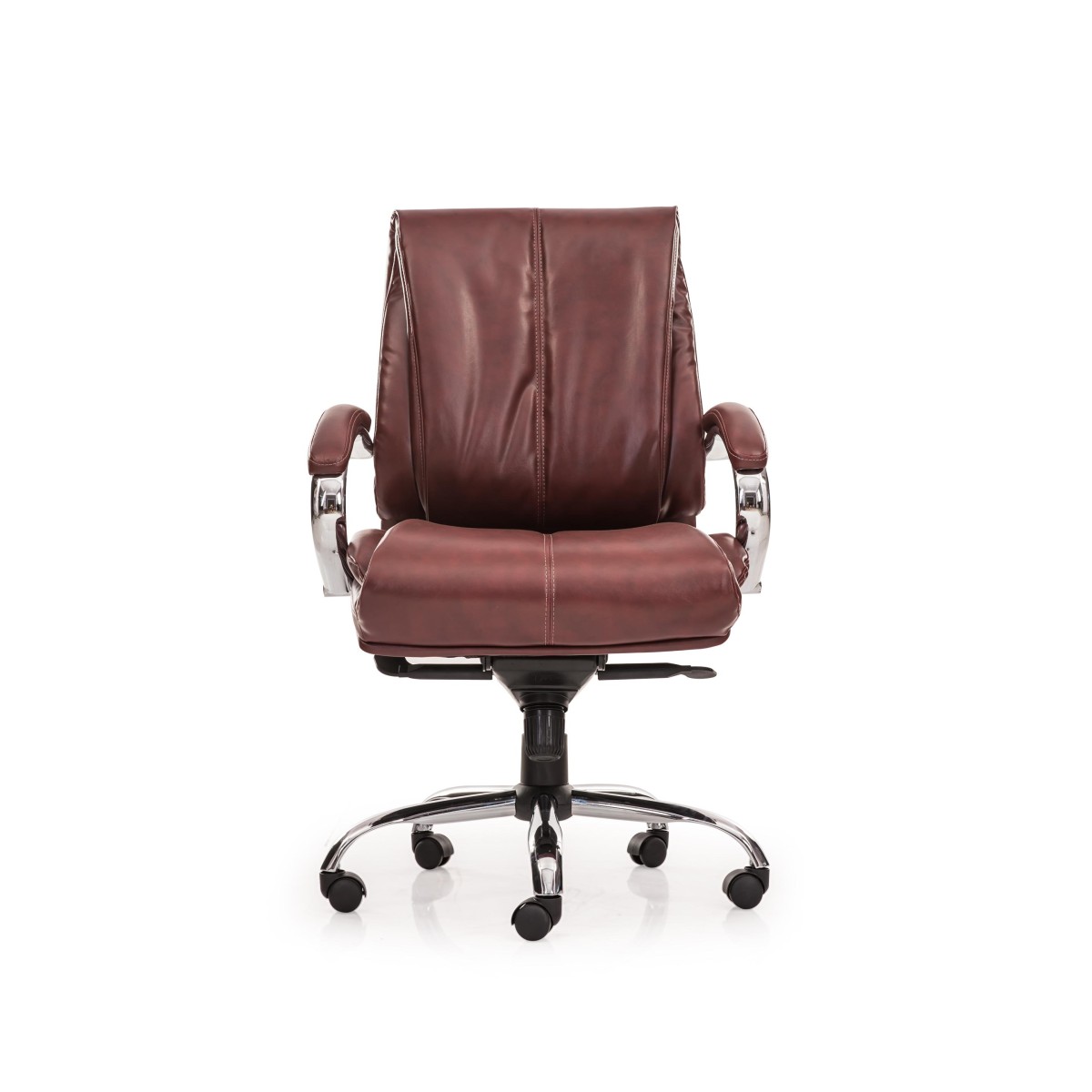 Low Back 360° Degree Revolving Chair. The Chair Made of Full Natural Leather In Red-Burgandy Colour. It Will Comes In Matte Finish About Style Type is Modern. Chrome Finish Arm Rest Covering With Natural Leather Pad. 12 mm Thick Hot Pressed BWR Plywood is Grade - 303 For Seat and Back. 40 ± 2 mm Thick Polyurethane Foam With Density 32 ±3 Kg Per CU Meter For Best Quality Cushioning In Seat. 40 ± 2 mm Thick Polyurethane Foam With Density 32 ±3 Kg Per CU Meter For Best Quality Cushioning In Back. Backrest Support Foam Design Based On Symmetrical Lumbar Support. Synchro Multi Locking Mechanism. Gas Lift 60mm Telescopic Pneumatic. 650 mm Strong Chrome Swivel Base With 55 mm Castors Pressure Bearing 1136 Kg.