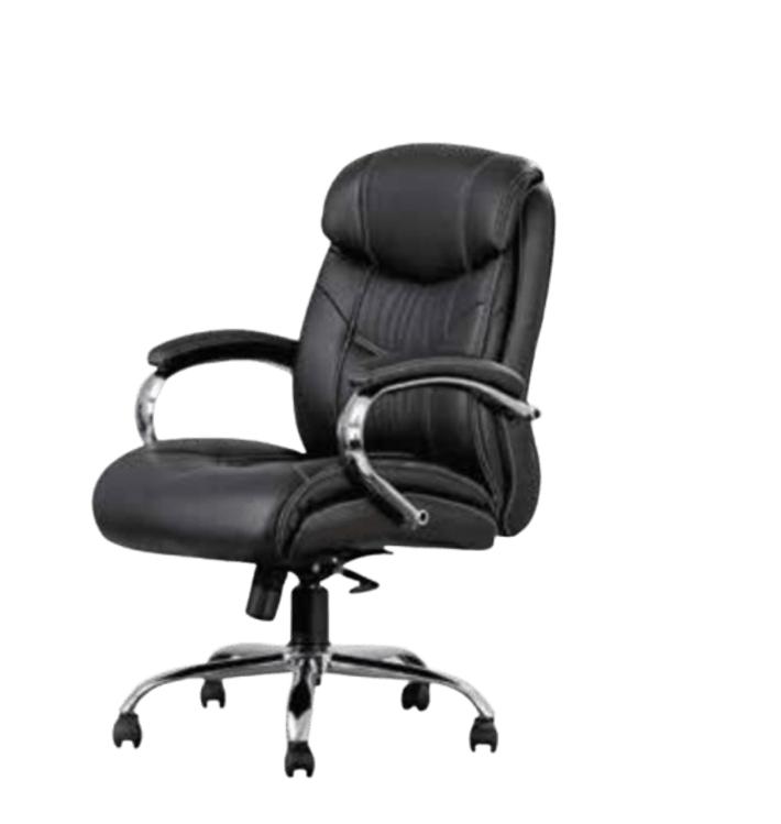 Revolving chair with Centre Tilt mechanism High quality PU Foam and recrown with heavy leatherette Fixed armrest with foam leatherette padding with Chrome base and Nylon castors