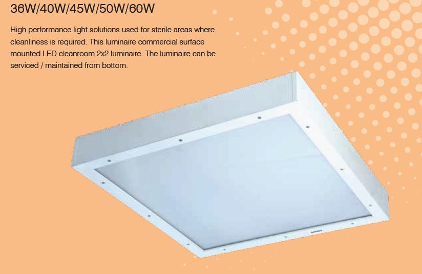 Bottom Opening Surface Cleanroom Lighting - High performance light solutions used for sterile areas where cleanliness is required. This luminaire commercial surface mounted LED cleanroom 2x2 luminaire. The luminaire can be serviced / maintained from bottom.