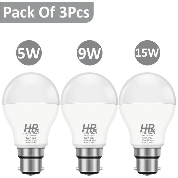 HP LED LIGHTING 5, 9, 15 W Cool White B22 3 piece LED Bulbs_1