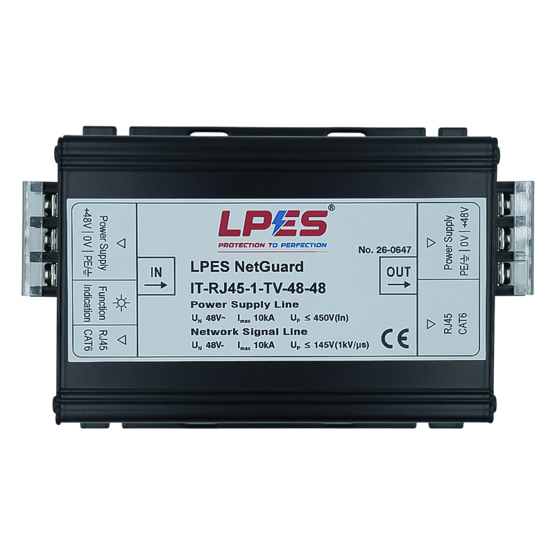 LPES NetGuard IT-RJ45-1-TV-48-48 is a surge protective device designed to protect 48V PoE Ethernet lines from transient overvoltages caused by lightning and switching surges. Installed in series with RJ45 communication lines, it safeguards both data transmission and PoE power circuits, helping maintain network stability and equipment safety. It is suitable for IP cameras, PoE switches, wireless access points, smart building controllers, industrial Ethernet devices, and telecom installations. The device offers fast response, high discharge capacity, low insertion loss, and reliable protection for critical connected systems. Built to support uninterrupted communication and reduced downtime, it complies with IEC 61643-21 / EN 61643-21 and is CE and RoHS certified, making it a dependable choice for commercial, surveillance, industrial, and network infrastructure applications.