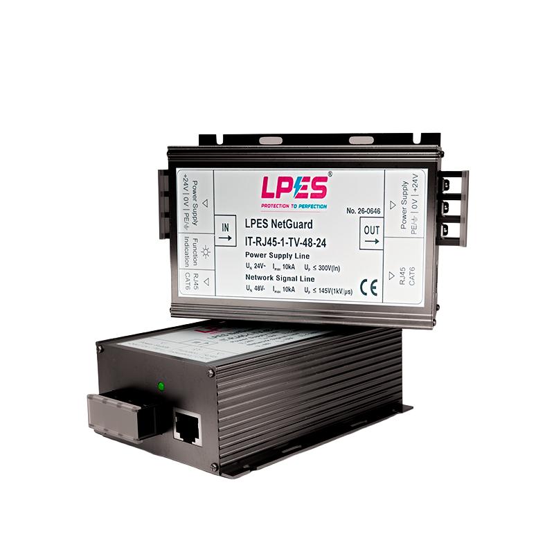LPES NetGuard IT-RJ45-1-TV-48-24 is a surge protective device designed for 48V PoE Ethernet lines used in IP surveillance, wireless access points, VoIP systems, smart building controls, and industrial communication networks. Installed in series with RJ45 lines, it protects both data pairs and PoE power circuits from transient overvoltages caused by lightning strikes and switching surges. The device supports stable data transmission while helping reduce equipment damage, downtime, and maintenance costs. With compact panel-friendly construction, grounding provision, fast response, and reliable surge handling capability, it is suitable for critical indoor network installations. It complies with IEC 61643-21 / EN 61643-21 and is CE and RoHS certified.