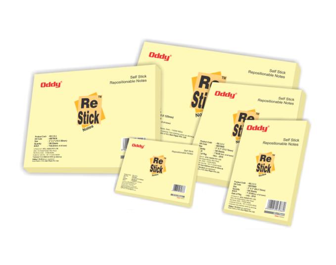 Oddy ®Re-Stick Notes with super sticky adhesive are perfect for massages on walls, doors, monitors, files, or other vertical surfaces. Features • Unlined Re-Stick Notes gives you ample room to express yourself • Re-Stick Notes are trusted, standard notes for massages & reminder around the office • Bright Classic hue of yellow • Re-Stick Notes are re-cycleble