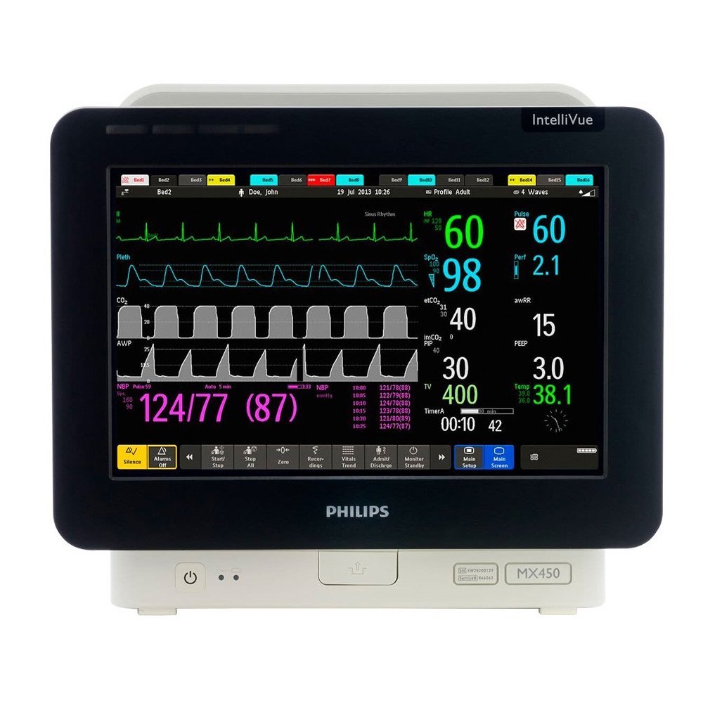 The Philips IntelliVue MX450 is a high-quality multiparameter patient monitor designed for continuous, real-time tracking of a patient’s vital signs in hospitals and clinical settings. It combines accurate measurement technology, easy-to-use controls, and a large, clear display to help clinicians monitor critical information efficiently and make faster, better-informed decisions for patient care. This monitor features a 12-inch high-resolution touchscreen that shows multiple vital parameters at once, including ECG (heart activity), SpO₂ (oxygen saturation), NIBP (non-invasive blood pressure), RESP (respiration rate), temperature, and more depending on configuration and optional modules. It is suitable for adult, pediatric, and neonatal patients in various hospital areas such as the ICU, emergency room, operating Theater, or general wards. Built with portability in mind, the MX450 has a compact design with a built-in handle and battery backup, making it easy to move with patients during