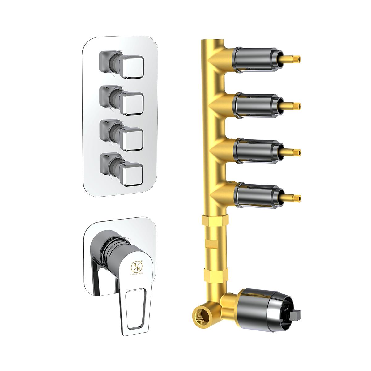 Introducing the RN 6-Way Single Lever Concealed Diverter Body with Expose Part Kit. Crafted from durable brass and finished with chrome plating, this diverter offers both style and longevity. The kit includes a concealed diverter body with 2 inlets and 4 outlets, and an expose part kit featuring an operating lever, wall flange, and knobs. The single lever design ensures easy control of multiple water outlets, while the sleek chrome finish resists corrosion. Enhance your plumbing setup with the versatile and elegant RN 6-Way Diverter.