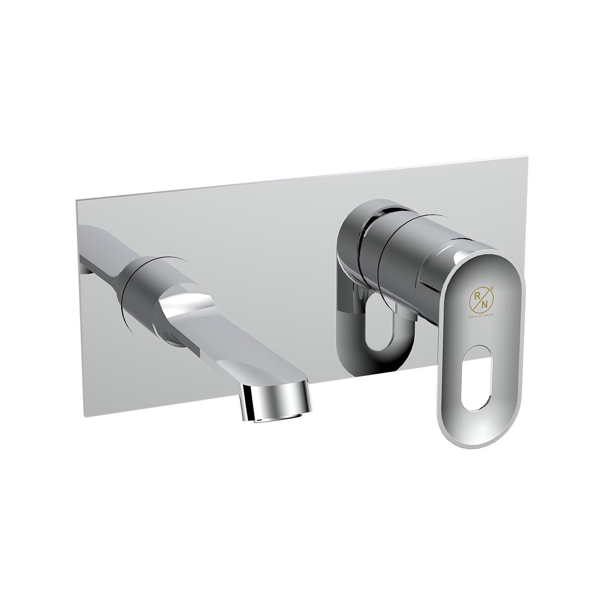 Introducing the RN Single Lever Expose Part Kit for Wall Mounted Basin Mixer. This kit, made from durable brass with a chrome-plated finish, includes an operating lever, wall flange, and spout. The sle...