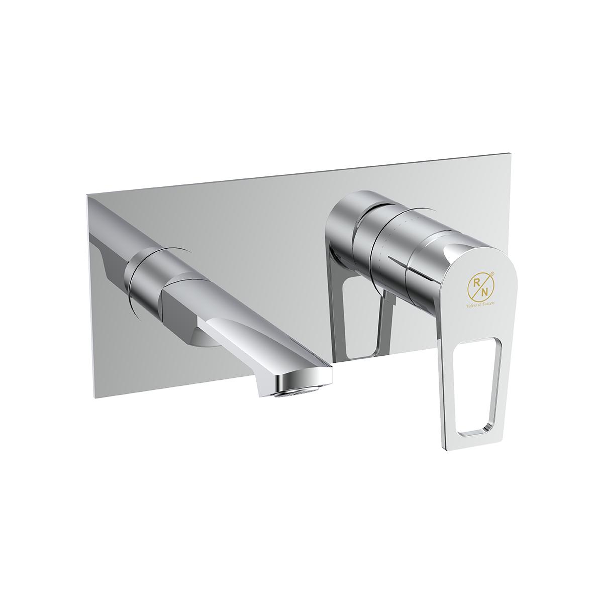 Introducing the RN Single Lever Expose Part Kit for Wall Mounted Basin Mixer. This kit, made from durable brass with a chrome-plated finish, includes an operating lever, wall flange, and spout. The sle...