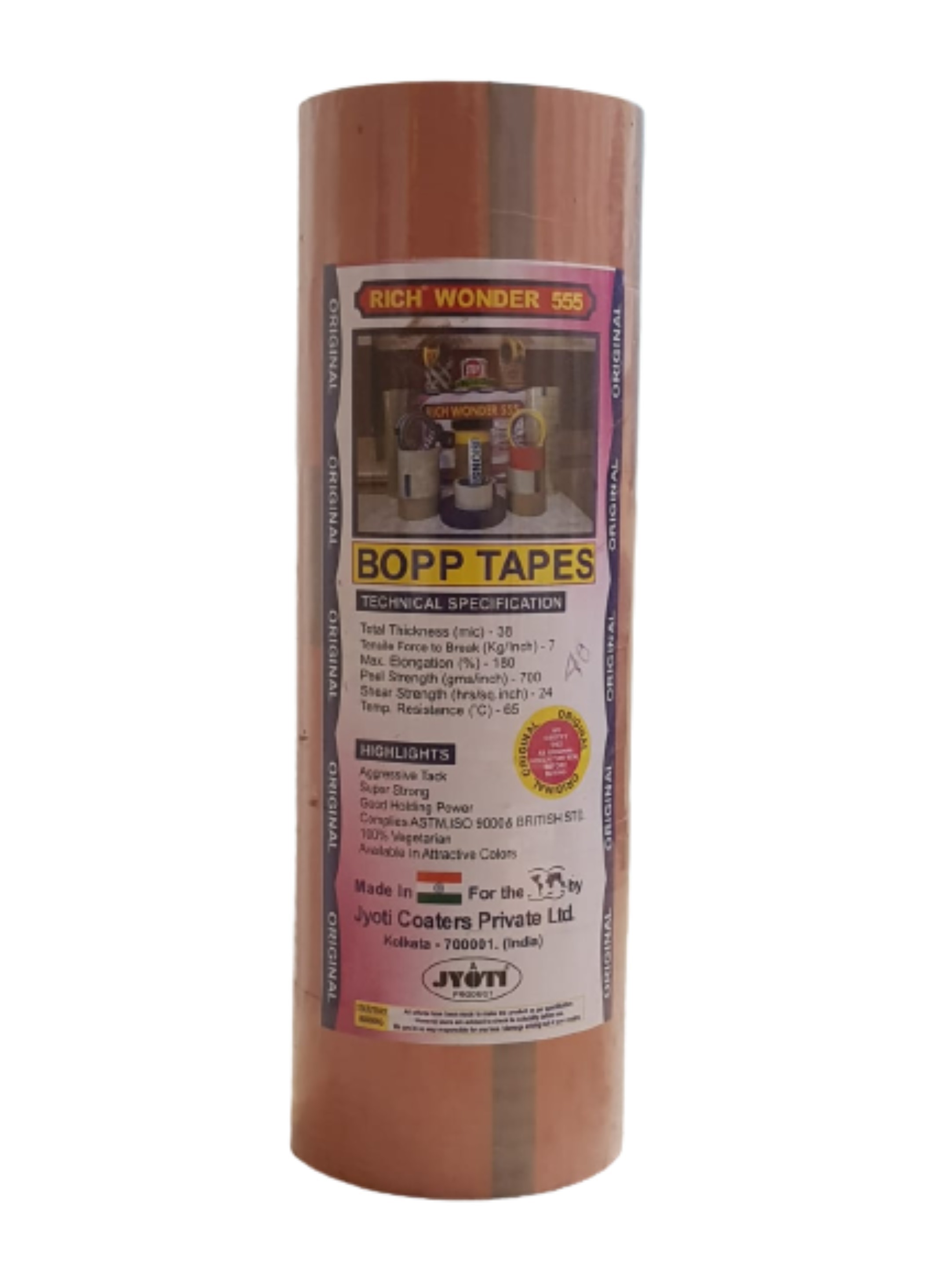 Rich Wonder 555 Bopp Tape Has an Agressive Acrylic Adhesive Which Is Tackified . No Other Indian Mfr Can Give This Stickiness Which Instantly Sticks to Paper and Corrugated Cartons .