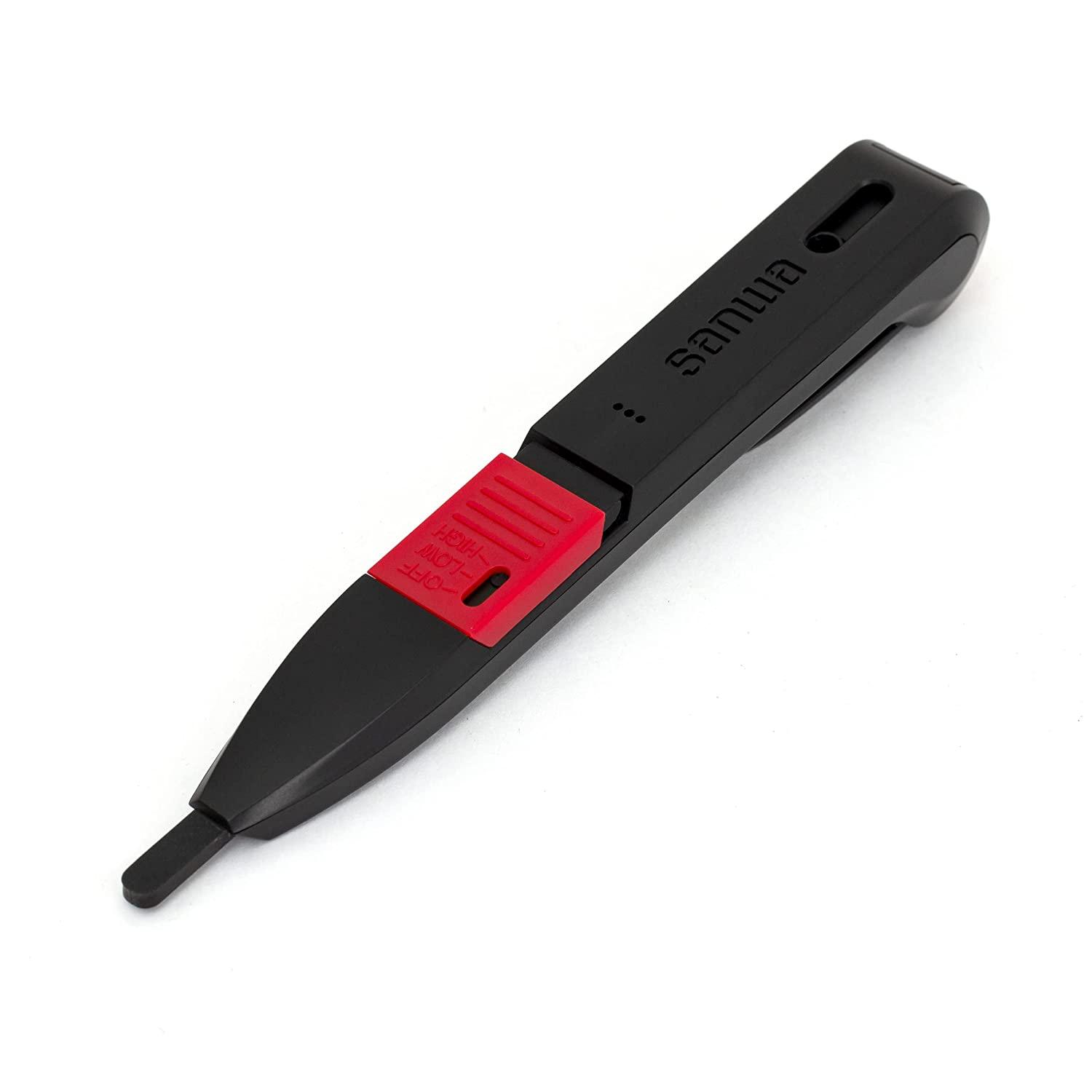 Detection with a loud beep and blinking LED Slim, easy-to-hold pen-shaped design Sensitivity switchable between HIGH and LOW Safety design equipped with a power LED
