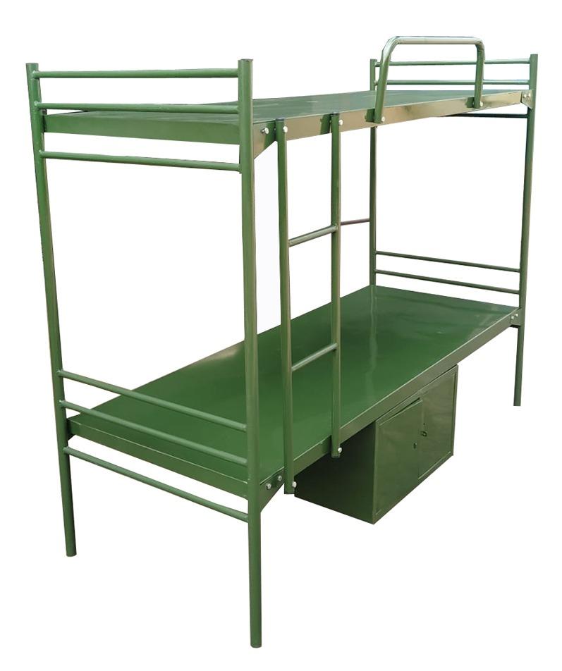Bunker Cot Two Tier (6’x3’x5') :- Mattress panel : 18G CRCA Sheet. Leg Frame : 2''x2'' Square CRCA Pipe 18G (1.2mm). Other vertical frame : 1'' Round CRCA Pipe 18G (1.2mm). Type : Two Tier. Bush : Nylon. Side Guard : Single Side. Ladder : Length wise. Storage Locker : 1 No. Shoe Rack : Provided. Locker size : 15''x24''. Finishing : Powder Coated.