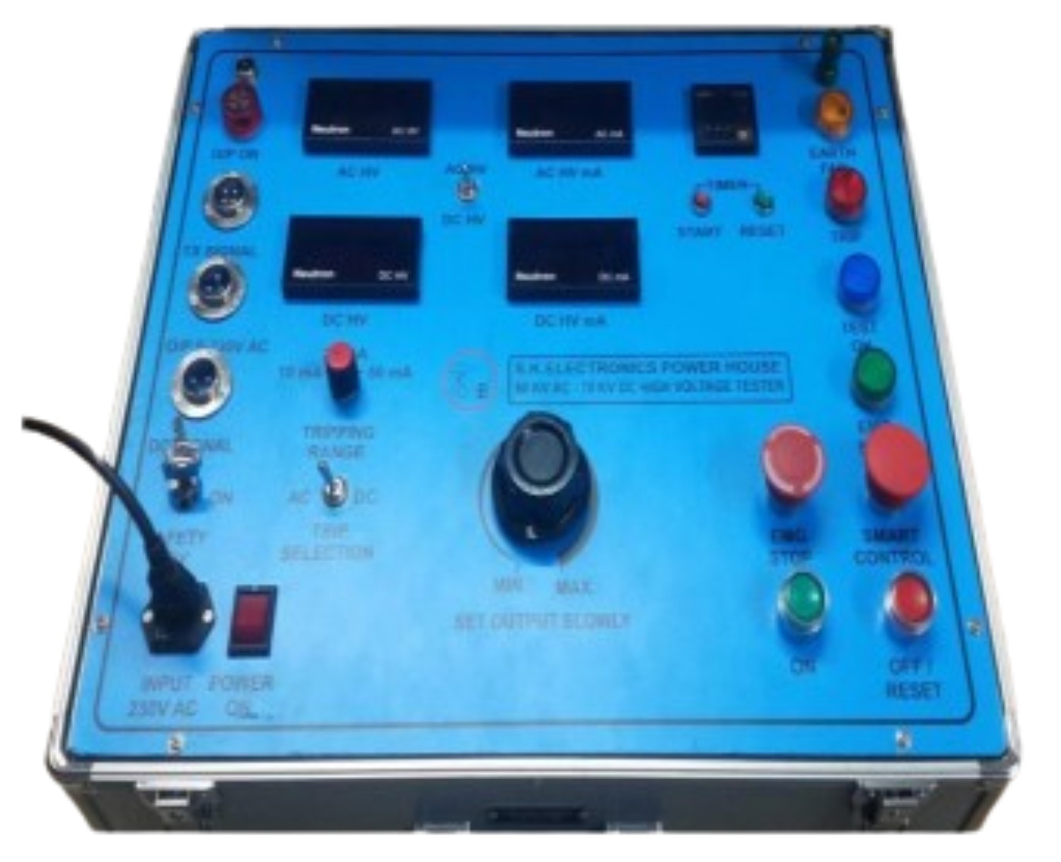 1. INPUT SUPPLY 230 VAC 50 Hz 1 Ph. 2. POWER ON Switch 3. SAFETY KEY 4. Control Unit Start and Stop Push Button 5. Timer ON Switch with indication 6. Timer RESET Push Button 7. Test ok indication lamp 8. Leakage current meter reading push ON Switch 9. Set High Voltage KNOB with zero start protection 10. Output High Voltage Indicating Meter for AC- DC 11. Output Current leakage Indicating Meter AC - DC 12. Input Supply short circuit Protection MCB 13. Input Supply IP 44 Socket 14. Output Supply on indication BUZER Lamp ON HV TX 15. Control Unit Body Earth Terminal 16. High Voltage Sensing Signal Socket 17. Earth fail protection with indication