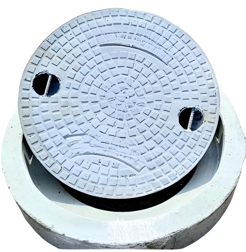 SFRC M30 precast cover and frame | Anti-skid finish | Tapered frame prevents jamming | Lifting hooks for easy removal | Factory water/steam-cured | Conforms to IS 12592 load tests