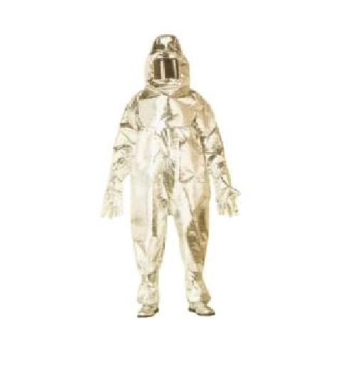 Aluminised Fiberglass Fire Suit with Pouch for BA set (optional) for protection from heat consisting of Aluminized Hood with Helmet & Polycarbonate Tinted Lens with MeshProtection Aluminized Coat + Pant or 1 Piece Aluminized Coverall as per requirement Aluminized 5 fingered Gloves Aluminized Boots with Nitrile Soles Outer layer Outer layer is made up of 430 gsm Commercial Grade Aluminised Glass fiber fabric. middle thermal barrier and innermost layer FR cotton