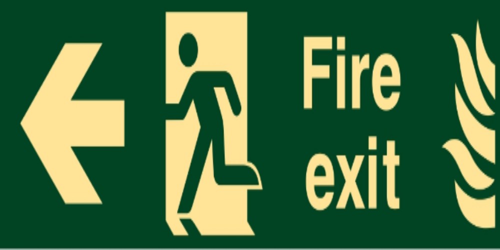 Fire Exit Signage with the symbol of Extinguisher, Directional Arrow (Left Arrow Symbol), and Running Man. We use a high-quality and durable 3MM ABS Sheet for a 4*12” rectangular shape with round corners sign board. Fire Exit Signage guides the escape path to the occupants in an emergency. The Fire Exit signage is universal and mandatory to install for the fastest escape from the emergency areas in a safe manner. Our Fire Exit Signage is as per National and International ISO Safety Norms. The signage has a green background with white color text and symbols. We do direct printing for a durable and long-lasting print. The signage is durable, weather resistant, with long service life. SUN SIGNS also provides superior quality Glow in Dark applications for the bright and continuous green-yellow or red-yellow glow to highlight the message at night or after power failure.