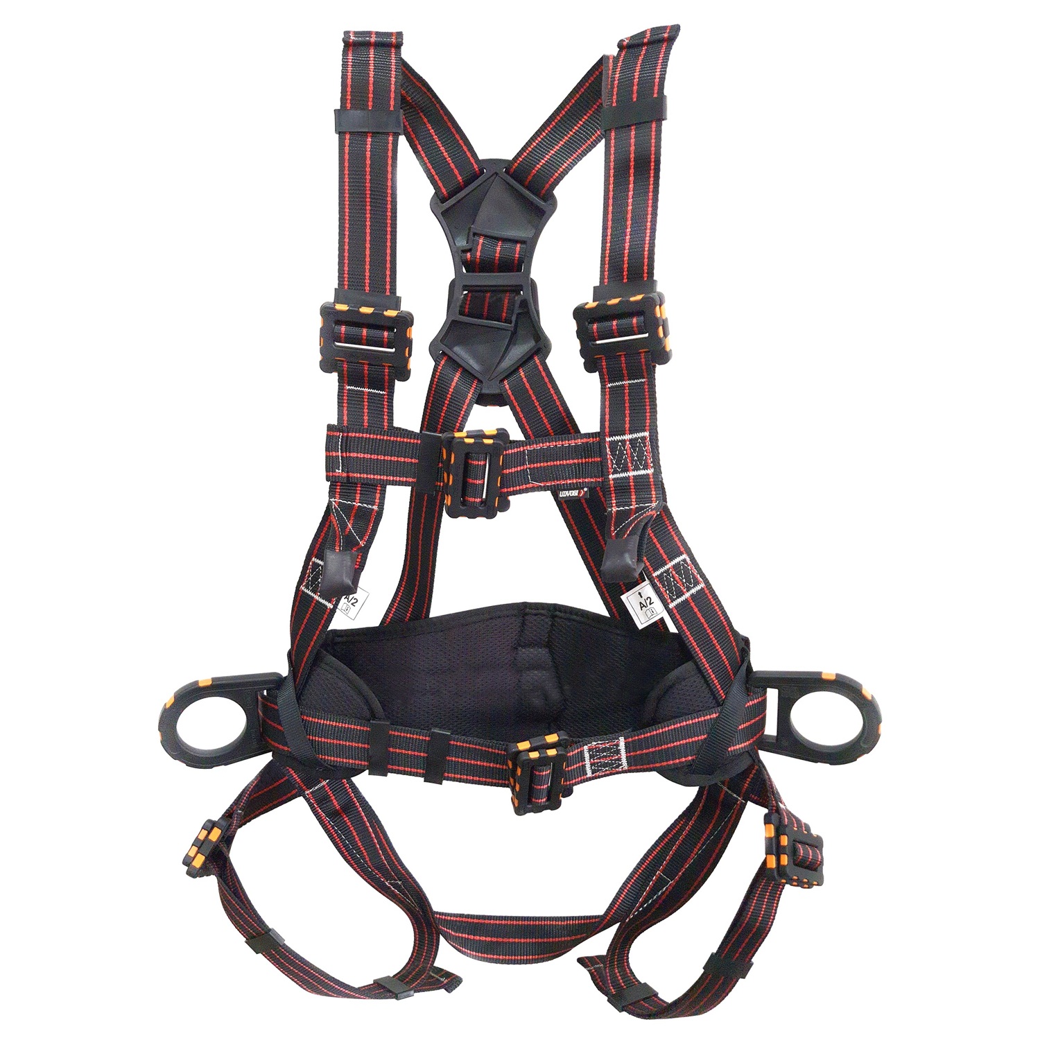 One dorsal D-ring for fall arrest & one front attachment Two D-rings on waist for work positioning Size adjustment straps only at Shoulders, chest and thigh Ideally positioned sit-strap for extended comfort Built-in dual colour webbing for easy orientation Integrated work positioning waist pad Standard: Approval & IS marking