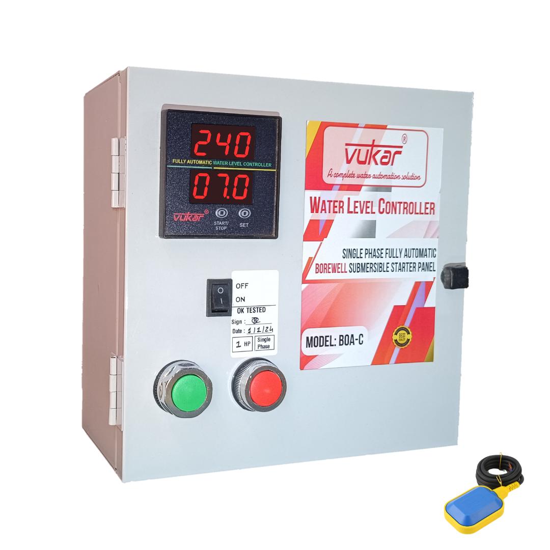 Single phase digital fully automatic water level controller motor starter panel board has dry run protection, motor overload protection, undervoltage protection, overvoltage protection and water level controller with float switch. Auto pump controller is designed for single phase borewell submersible pump to operate as per the level of water in tank using the float switch.