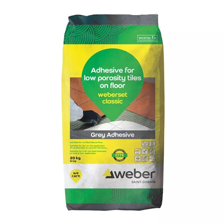 Weberset classic is a high polymer modified thinset adhesive, specially formulated for fixing vitrified tiles on the floor in internal areas. The adhesive can also be used for fixing ceramic tiles on wall and floor and is suitable for dry as well as wet areas for internal application. This is also suitable for tile-on-tile application for fixing vitrified tiles on pre-existing ceramic tile floors. Please refer tile/substrate sheet for more details.